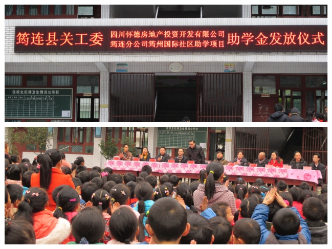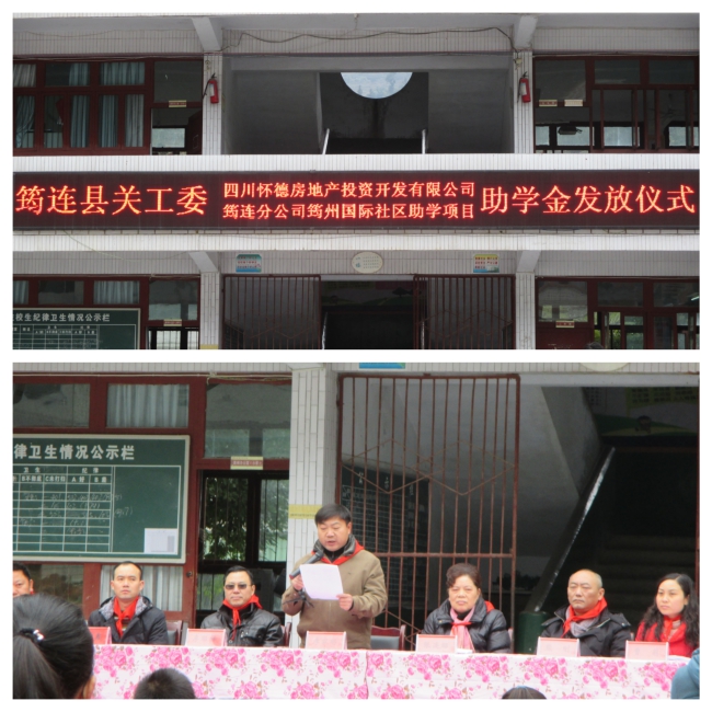 12月17日上午11点,筠连县“关爱基金”四川怀德房地产投资开发有限公司扶贫助学金发放仪式在联合苗族乡中心校举行,为此次联合苗族乡中心校获得助学金的50位同学发放助学金。县人大常委会、县关工委副主任、县关工委执行主任、四川怀德房地产投资开发有限公司筠连分公司总经理、联合苗族乡中心校校长等人以及联合苗族乡中心校全校师生和部分受助学生家长参加了此次仪式。